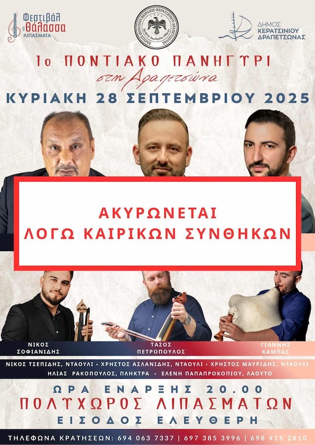 Η ΕΚΔΗΛΩΣΗ ΤΗΣ ΕΝΩΣΗΣ ΠΟΝΤΙΩΝ ΠΕΙΡΑΙΑ-ΚΕΡΑΤΣΙΝΙΟΥ-ΔΡΑΠΕΤΣΩΝΑΣ ΑΚΥΡΩΝΕΤΑΙ Μετά από απόφαση του συλλόγου η εκδήλωση της Κυριακής στον Πολυχώρο των Λιπασμάτων ακυρώνεται λόγω καιρικών συνθηκών....